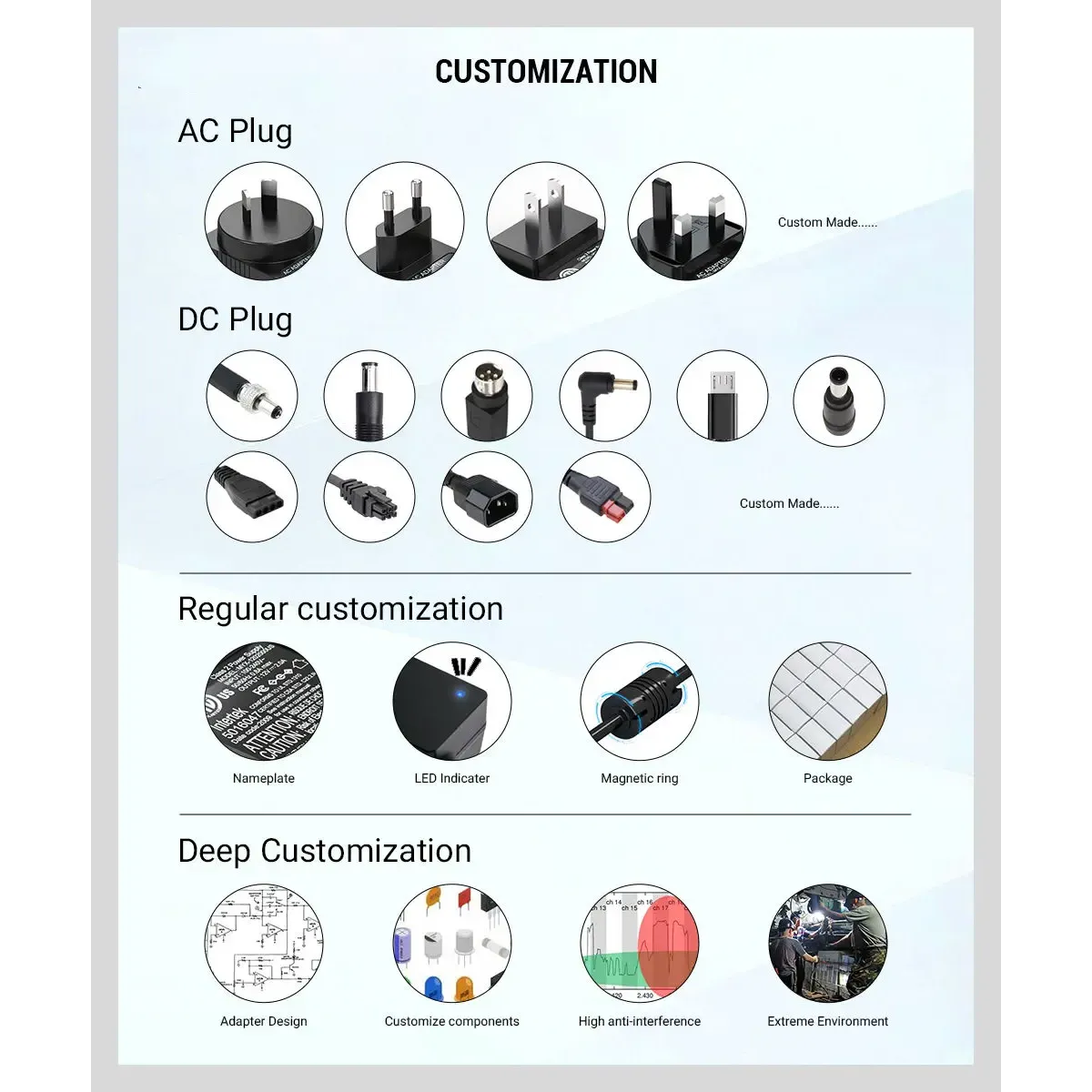 আর: আমরা চীনের শেনজেনে এসি/ডিসি অ্যাডাপ্টার এবং পাওয়ার সাপ্লাইতে 12 বছরের অভিজ্ঞতার সাথে পেশাদার প্রস্তুতকারক।