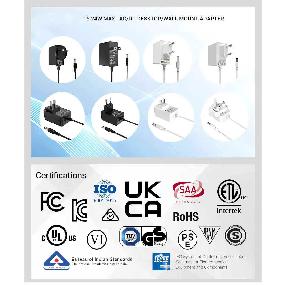 24W পাওয়ার অ্যাডাপ্টার সিরিজ কঠোর আন্তর্জাতিক মান পূরণ করে এবং CE/FCC/UL/RCM/SAA/UKCE/KC/BIS/PSE শংসাপত্র সহ বিশ্বব্যাপী সার্টিফিকেশন নিয়ে গর্ব করে, নিরাপত্তা এবং পরিবেশগত সম্মতি নিশ্চিত করে। এর ইউরোপীয় প্লাগ ডিজাইন নিরাপদ সংযোগের জন্য অনুমতি দেয়, এটি বিভিন্ন সেটিংসে ব্যবহার করা সহজ করে তোলে।