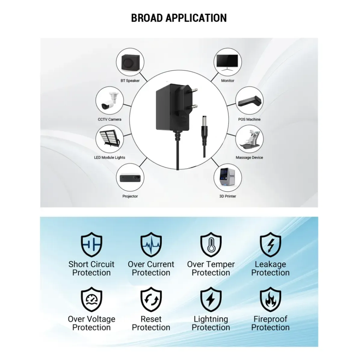 2. বিস্তৃত সামঞ্জস্যতা: এর স্ট্যান্ডার্ড 12V আউটপুট এবং সাধারণ DC ব্যারেল প্লাগ (সাধারণত 5.5*2.1 মিমি) সহ, এটি বিভিন্ন ডিভাইস যেমন রাউটার, নেটওয়ার্ক সুইচ, নিরাপত্তা ক্যামেরা, সেট-টপ বক্স এবং গেমিং কনসোলের জন্য উপযুক্ত।