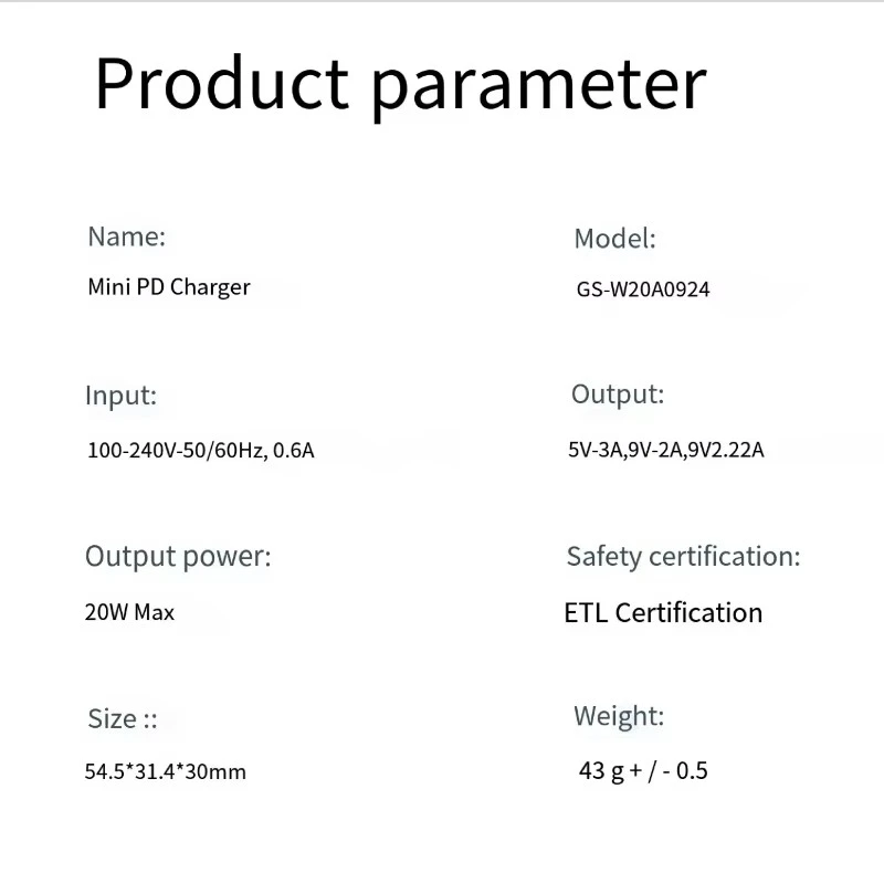 20W জাপান সংস্করণ প্লাগ PD চার্জার স্পেসিফিকেশন: