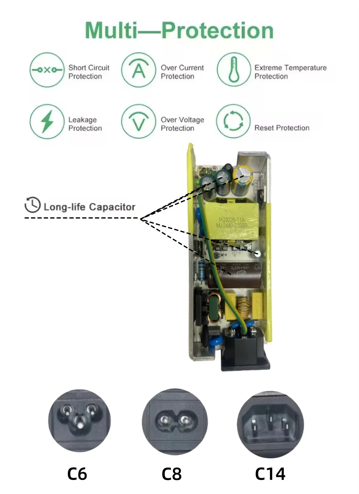 ব্যাপক নিরাপত্তা সুরক্ষা: ওভার-কারেন্ট প্রোটেকশন (OCP), ওভার-ভোল্টেজ সুরক্ষা (OVP), এবং শর্ট-সার্কিট সুরক্ষা (SCP) সহ সমন্বিত সুরক্ষাগুলি অ্যাডাপ্টার এবং আপনার মূল্যবান সরঞ্জাম উভয়ের ক্ষতি প্রতিরোধ করে।