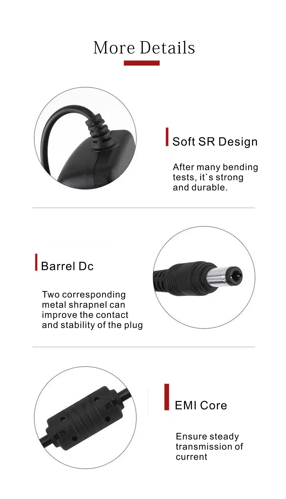 3. সংযোগকারী ফিট: প্লাগের আকার নিশ্চিত করুন (যেমন, 5.5 মিমি x 2.1 মিমি) এবং পোলারিটি (প্রায়ই কেন্দ্র-পজিটিভ) আপনার ডিভাইসের ডিসি জ্যাকের সাথে মেলে। অমিল ক্ষতির কারণ হতে পারে।