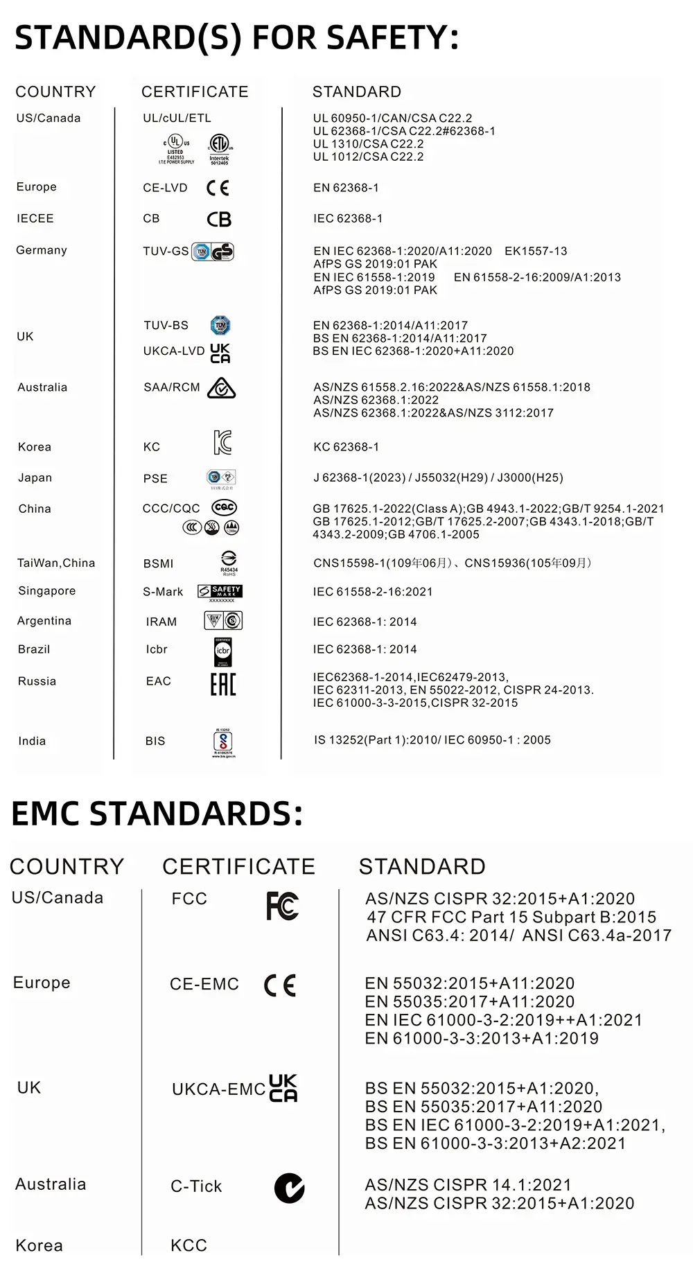 আপনার নিরাপত্তা সর্বাগ্রে. এই অ্যাডাপ্টারটি কঠোর আন্তর্জাতিক মান পূরণ করার জন্য ডিজাইন এবং তৈরি করা হয়েছে, শুধুমাত্র নির্ভরযোগ্য কর্মক্ষমতাই নয় মনের শান্তিও নিশ্চিত করে। এটি ETL CE FCC TUV GS CB PSE KC KCC BIS SAA RCM c-Tick CCC UKCA UL cUL RoHS এর সাথে সঙ্গতিপূর্ণ, যা নিরাপত্তা, স্বাস্থ্য এবং পরিবেশগত সুরক্ষা নিয়ন্ত্রণ করে৷