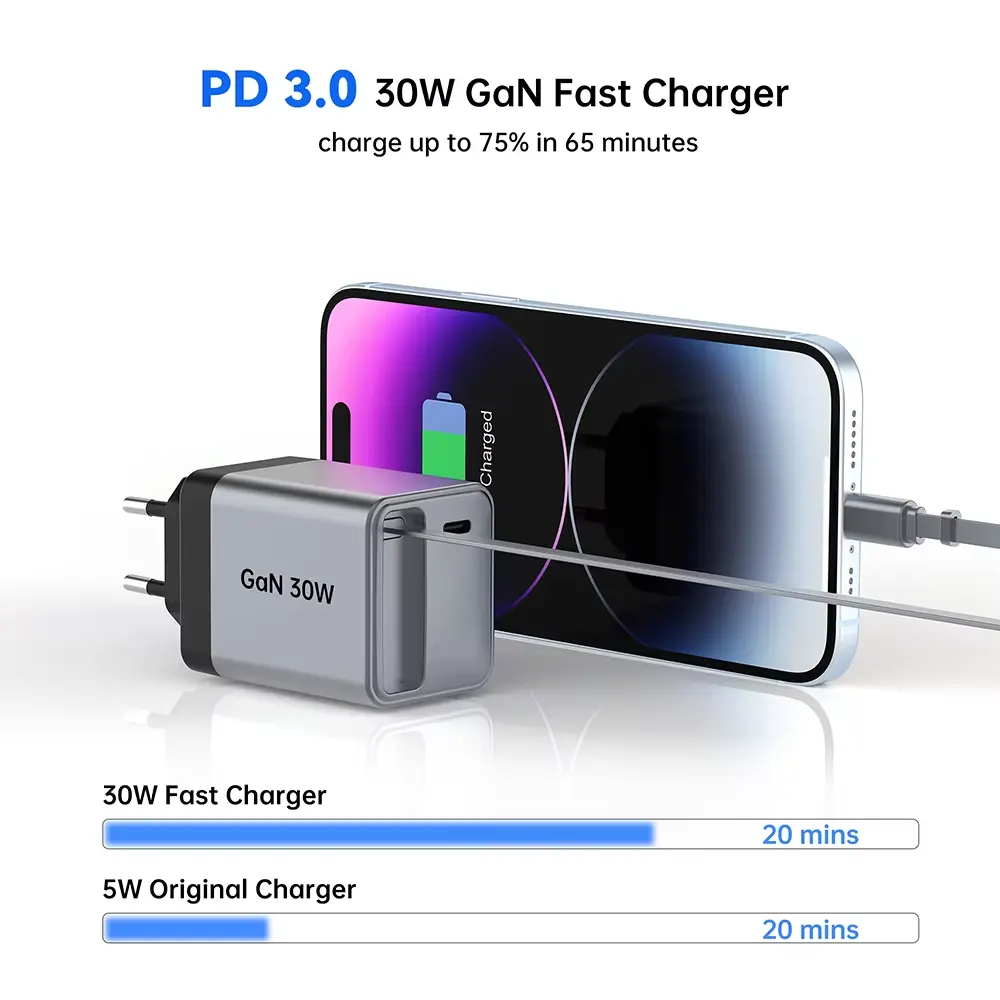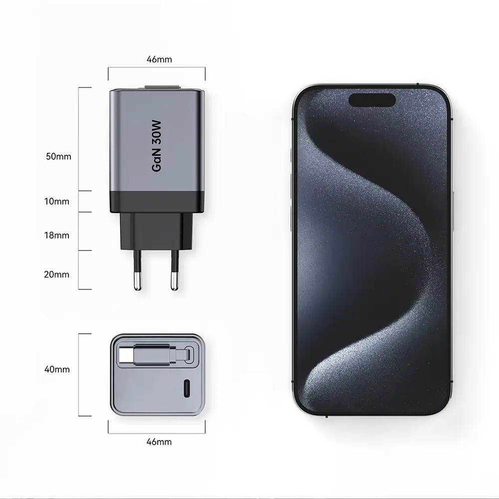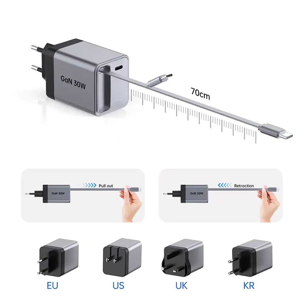 প্রত্যাহারযোগ্য টাইপ সি কেবল বৈশিষ্ট্য সহ 30W কুইক চার্জার: