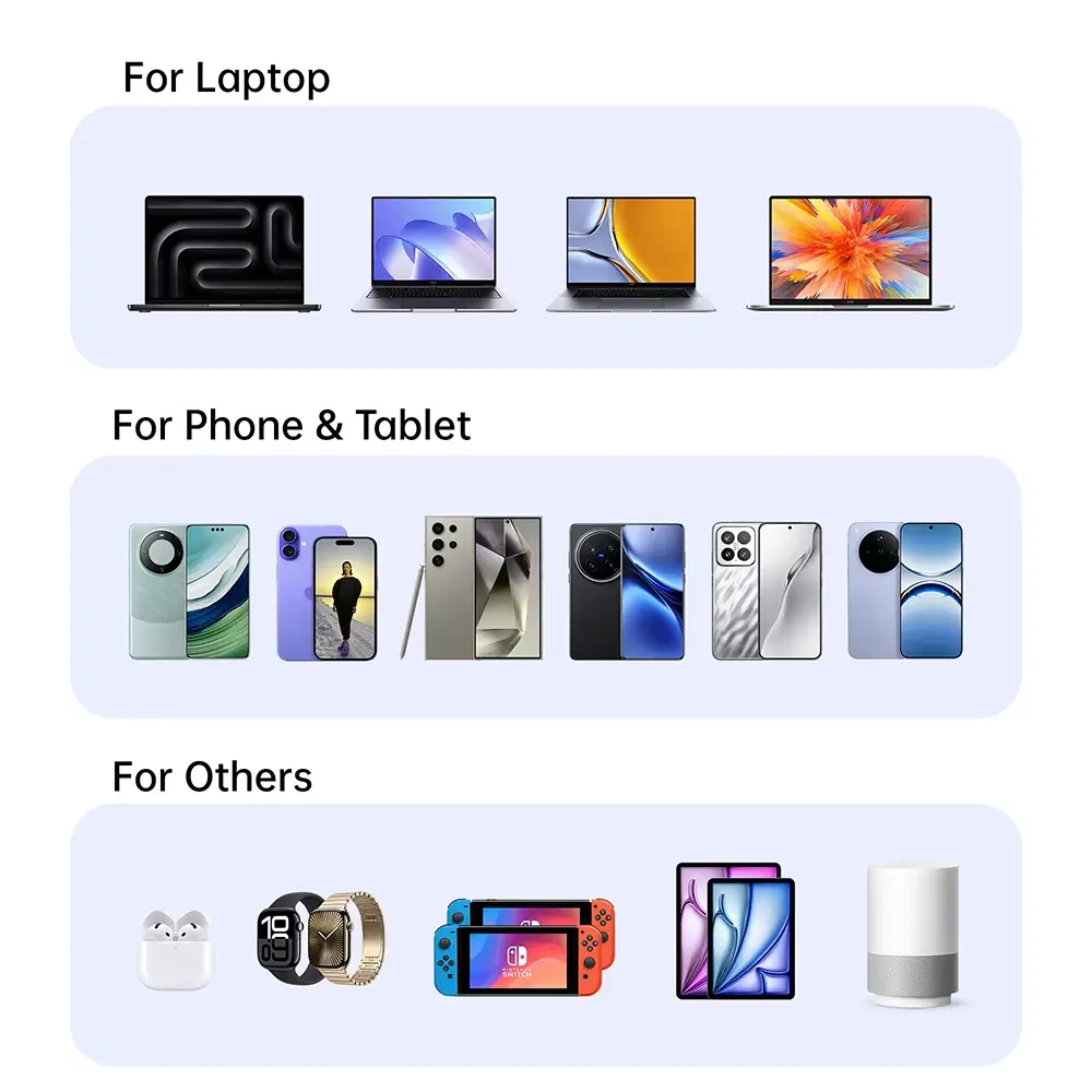 মোবাইল ফোন, হেডফোন এবং গেমিং আনুষাঙ্গিক সহ USB-C ডিভাইসের সাথে সামঞ্জস্যপূর্ণ। নিরাপদ এবং কার্যকর চার্জিংয়ের জন্য ডিভাইসের প্রয়োজনীয়তা স্বয়ংক্রিয়ভাবে সনাক্ত করে। 4. ট্রাভেল-রেডি পোর্টেবিলিটি
