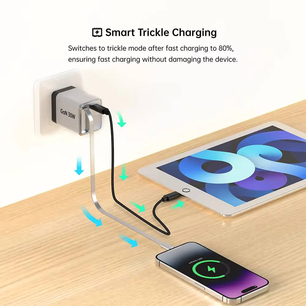 প্রত্যাহারযোগ্য টাইপ সি কেবলের অতি-হালকা, পকেট-আকারের নকশা সহ 30W কুইক চার্জার এটিকে বহন করা সহজ করে তোলে। এটি বাড়ি, অফিস বা ভ্রমণের জন্য নিখুঁত পছন্দ।