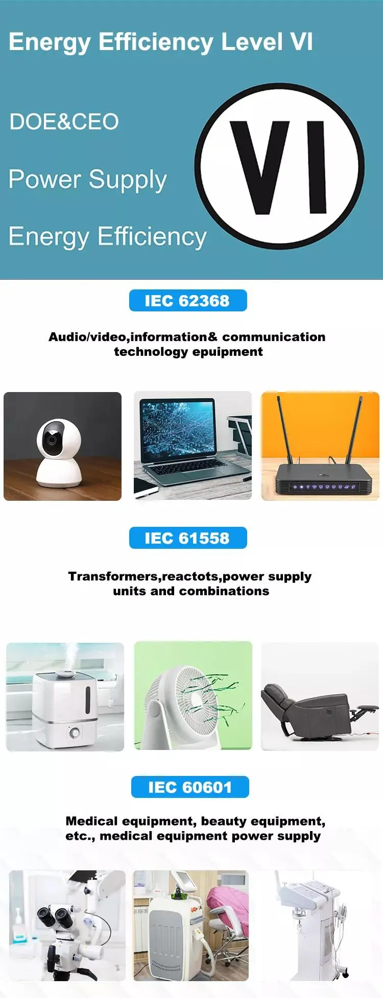 কনজিউমার ইলেকট্রনিক্সের জন্য IEC62368, ব্যাটারি চার্জারের জন্য IEC60335, মেডিকেল গ্রেড সরঞ্জামের জন্য IEC60601, হোম অ্যাপ্লিকেশনের জন্য IEC61558, LED আলোর জন্য IEC61347। |