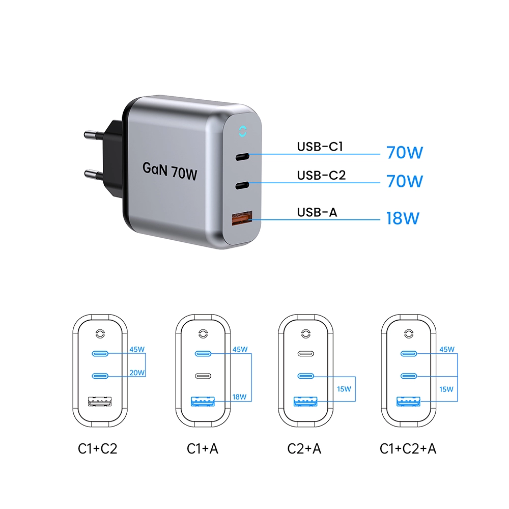 C1/C2 আউটপুট: 5V3A,9V3A,12V3A,15V3A,20.6V3.4A (70W সর্বোচ্চ) PPS: 3.3-11V 4.05A USB-A আউটপুট: 5V3A,9V2A,12V1.5A 3.3-11V 2A(22W সর্বোচ্চ) C1+C2 আউটপুট: 45W+20W C1+C2+USB-A আউটপুট: 45W+5V3A মোট: 70W |