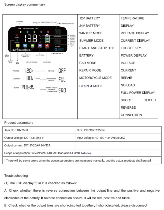 ব্যবহারকারী-বান্ধব ইন্টারফেস: একটি পরিষ্কার, উজ্জ্বল LED ডিসপ্লে স্বজ্ঞাতভাবে চার্জিং স্ট্যাটাস, ব্যাটারি স্বাস্থ্য এবং যেকোনো সম্ভাব্য ত্রুটি নির্দেশ করে, যা আপনাকে সম্পূর্ণ নিয়ন্ত্রণে রাখে।